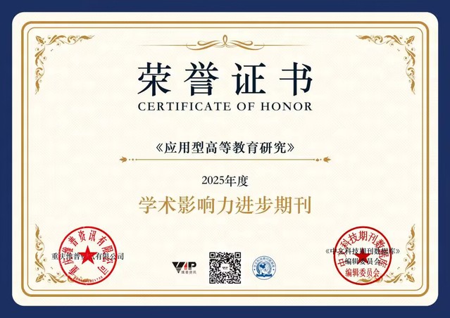 近日,由我校主辦的《應用型高等教育研究》被重慶維普資訊有限公司和《中文科技期刊數據庫》編輯委員會授予2025年度“學術影響力進步期刊”榮譽。