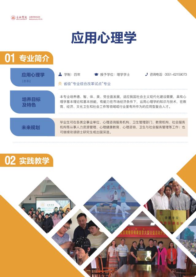 應(yīng)用心理學(xué)(本科) 咨詢電話:0551-62159073 省級“專業(yè)綜合改革試點(diǎn)”專業(yè) 學(xué) 制:四年 授予學(xué)位:理學(xué)學(xué)士 培養(yǎng)目標(biāo)及特色:本專業(yè)培養(yǎng)德智體美勞全面發(fā)展,適應(yīng)我國社會主義現(xiàn)代化建設(shè)需要,具有心理學(xué)基本理論和基本技能,有能力在市場經(jīng)濟(jì)條件下,運(yùn)用心理學(xué)的知識與技術(shù),在教育、經(jīng)濟(jì)、文化衛(wèi)生和社會工作等領(lǐng)域或行業(yè)里有所作為的應(yīng)用型復(fù)合人才。 畢業(yè)生發(fā)展方向:畢業(yè)生可在各類企事業(yè)單位、心理咨詢服務(wù)機(jī)構(gòu)、衛(wèi)生管理部門、教育機(jī)構(gòu)、社會服務(wù)機(jī)構(gòu)等從事人力資源管理、心理健康教育、心理咨詢、衛(wèi)生與社會服務(wù)管理等工作;也可繼續(xù)攻讀碩士研究生或出國深造。