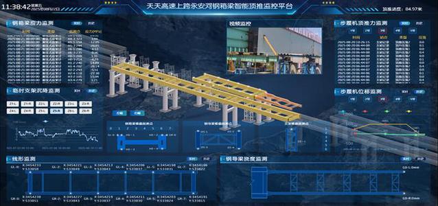 該智能頂推安全監控系統平臺是由合肥大學完全自主研發的在線監測系統,以結構安全和施工過程預警為導向,深度融合了物聯網、大數據、云/邊緣計算、人工智能以及數字孿生等先進理念,可廣泛應用于橋梁、房屋、隧道、邊坡等結構安全在線監測與健康管理。該系統利用云平臺共享技術,通過預設無線傳輸設備模塊,實現了監測數據融合、三維施工模擬、參數閾值預警等多項功能。為了應對本次施工安全需求,研究團隊等對智能監控平臺進行了定制化模塊開發,包括鋼箱梁、臨時支架、鋼導梁、步履機施工過程參數及現場視頻信息傳輸等模塊建設。結合無線傳輸和實時數據采集技術,實現了鋼箱梁頂推過程中主要參數的實時監測。經過2個多月的現場實踐,智能監控系統實時完整記錄并分析了施工階段各項關鍵參數,為類似橋梁安全施工提供了可靠的數字化監測平臺。