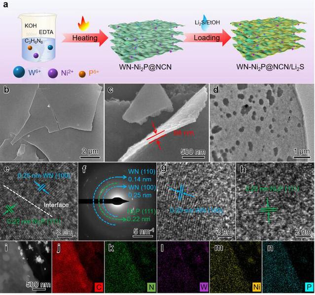 團隊發(fā)現(xiàn)并驗證了WN-Ni2P在提升鋰硫電池性能方面的關(guān)鍵作用。相關(guān)研究以“In?situ construction of WN-Ni2P heterostructures embedded in nitrogen?doped carbon nanoflakes as lithium sulfide hosts for advanced lithium?sulfur batteries”為題,發(fā)表于《Rare Metals》。梁升為第一作者,合肥大學(xué)能源材料與化工學(xué)院為第一完成單位。