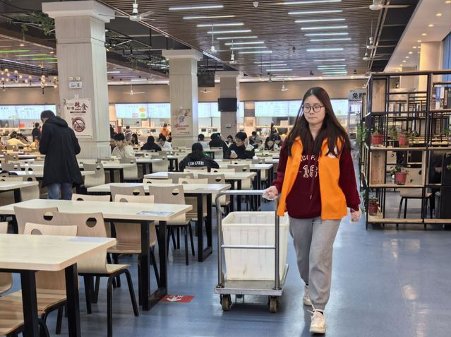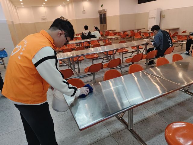 在食堂的衛生保障工作中,志愿者們發揮著重要作用。每日中午和晚上的用餐高峰時段,他們便活躍于餐具回收處,積極宣揚“光盤行動”理念,大力倡導節約糧食,提醒同學們按需取餐,避免浪費。同時,志愿者們還自發地清理餐桌,將用過的餐具整理歸類,為后續的清理工作提供便利。他們耐心引導同學們文明排隊,有序就餐,有效維護了食堂的用餐秩序。在志愿者們的努力下,食堂環境得到了顯著改善,同學們也能在整潔、有序的氛圍中享受用餐時光。