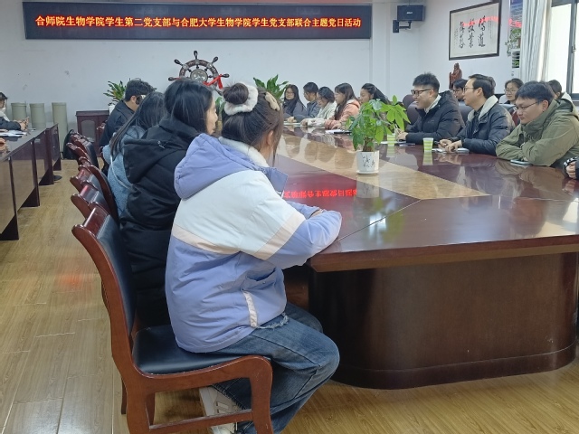 2024年12月31日上午9點,合肥大學生物學院學生黨支部與合肥師范學院生物學院學生第二黨支部,在合肥大學生化樓三樓會議室開展聯合主題黨日活動。此次活動由合肥大學生物食品與環境學院生工系學生黨支部書記陳玲主持,食品專業學生黨支部書記趙暮雨,環工系學生黨支部書記楊林,合肥師范學院生物學院學生第二黨支部書記徐浩然,學生第一黨支部書記周其松,以及兩校部分黨員代表參加。