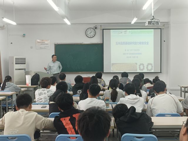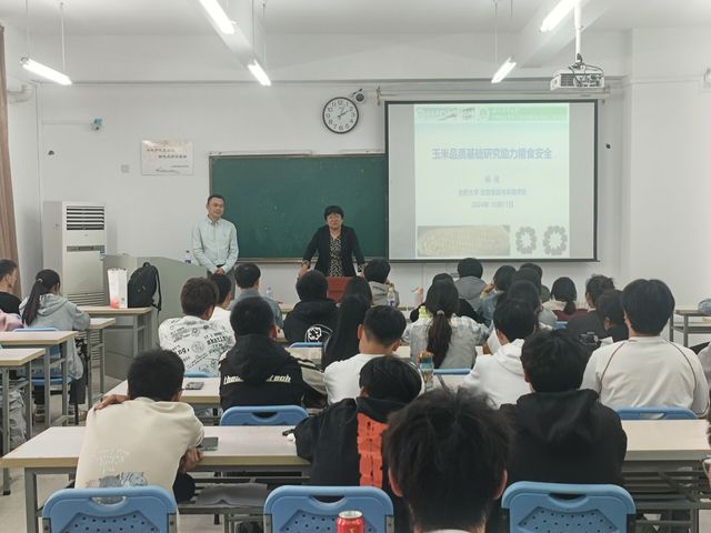 為加強(qiáng)學(xué)校與校友之間的聯(lián)系,分發(fā)揮優(yōu)秀校友的示范引領(lǐng)作用,幫助學(xué)生看清自身發(fā)展方向,2024年10月11日,生物食品與環(huán)境學(xué)院在生化樓201教室舉辦了一場以“玉米品質(zhì)基礎(chǔ)研究助力糧食安全”為主題的精彩講座。本次講座由我校杰出校友楊俊擔(dān)任主講,生物食品與環(huán)境學(xué)院黨委書記李秀娟、院團(tuán)委負(fù)責(zé)人楊林與會(huì),22食安以及24生工3班學(xué)生參與。