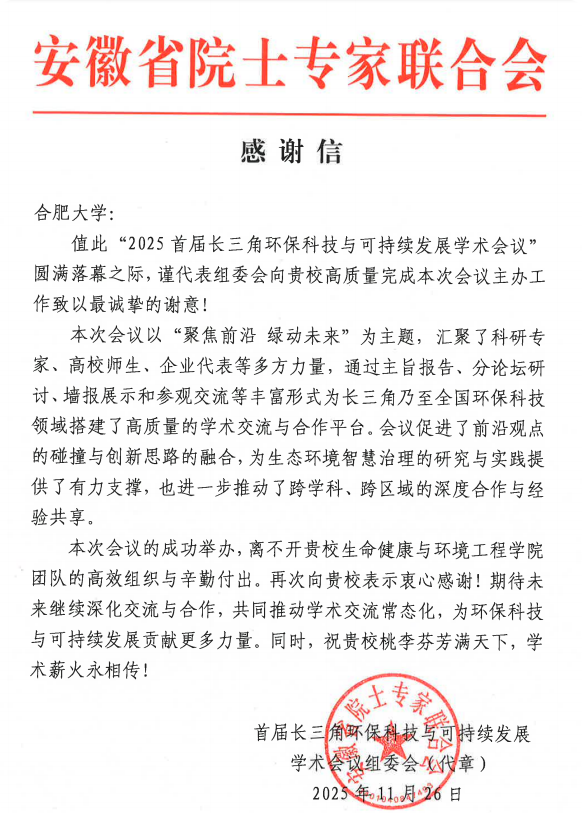 本次會(huì)議的成功舉辦,為長(zhǎng)三角地區(qū)環(huán)??萍寂c可持續(xù)發(fā)展領(lǐng)域搭建了高水平的學(xué)術(shù)交流平臺(tái),有效促進(jìn)了“政產(chǎn)學(xué)研用推”的深度融合,顯著提升了合肥大學(xué)在該領(lǐng)域影響力。未來(lái),合肥大學(xué)將繼續(xù)與各高校、科研院所及行業(yè)企業(yè)開(kāi)展多維度合作,通過(guò)聯(lián)合攻關(guān)、成果轉(zhuǎn)化與人才共育,共同推動(dòng)環(huán)??萍碱I(lǐng)域的持續(xù)進(jìn)步與創(chuàng)新發(fā)展,為服務(wù)地方經(jīng)濟(jì)社會(huì)綠色轉(zhuǎn)型貢獻(xiàn)合大力量。