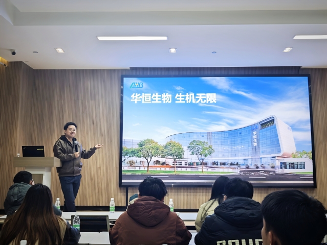研究院參觀結束后,同學們齊聚會議室,聆聽了一堂專題企業文化課。企業相關負責人介紹了華恒公司企業的使命、愿景與核心價值觀。 “發展生物技術,服務生命健康”——利用先進的生物制造技術,提供綠色、可持續的產品和解決方案,最終服務于人類健康和生活品質的提升,這與國家“雙碳”戰略和綠色產業發展方向高度契合。從實驗室的嚴謹操作到生產線的工藝優化,都體現著對實效的追求。隨后圍繞“華恒奮斗史”這一主題,結合公司發展中的關鍵事件與人物故事,生動闡述了華恒生物“成就客戶,開放共贏,創新卓越,奮斗為本”的核心價值觀。課程不僅介紹了企業的戰略規劃與產品矩陣,更分享了華恒人在面對技術難關與市場挑戰時展現出的堅韌不拔、勇于創新的精神風貌。企業發展與國家生物經濟發展的同頻共振,也讓同學們對個人專業學習與國家產業需求之間的聯系有了更深層次認識。