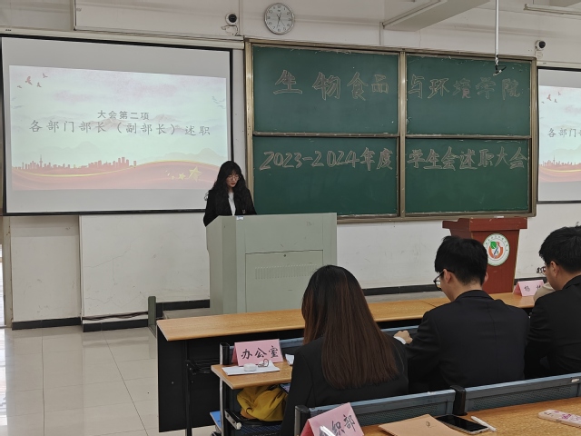 4月10日中午十二點半,生物食品與環(huán)境學院2023--2024學年第二學期學生會述職大會于生化樓一階梯準時舉行。出席本次會議的有黨委副書記晉松、團委負責人楊林、團委學生會主席團成員、各部門部長以及委員。本次會議由主席團樂雯軒主持。