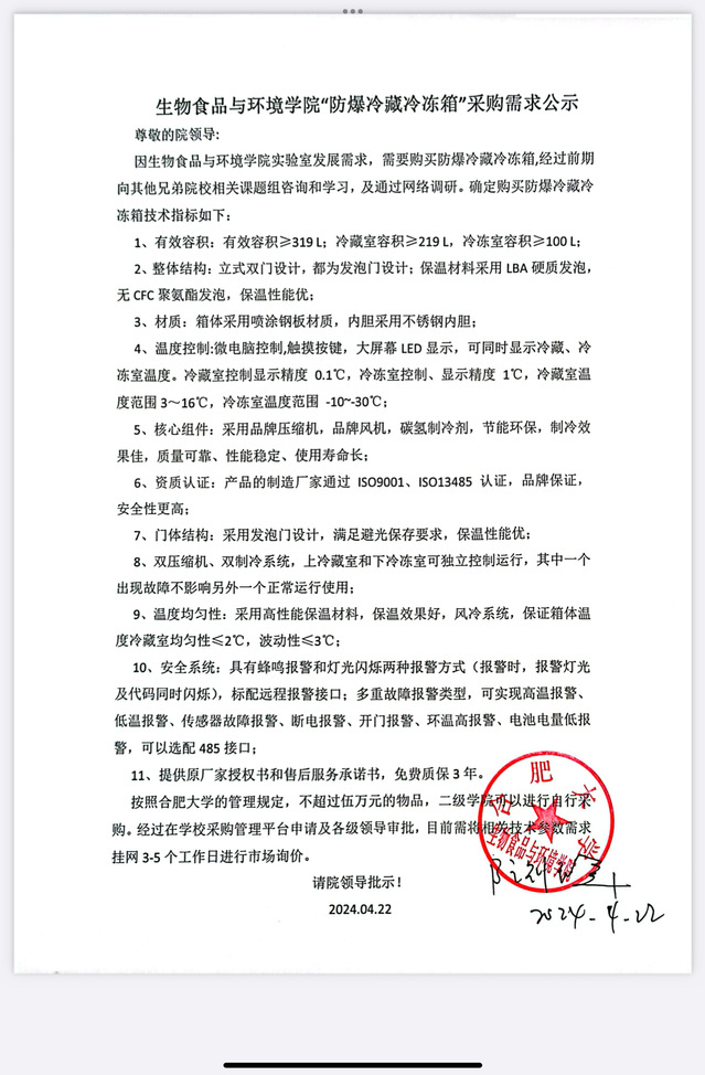 生物食品與環(huán)境學院“防爆冷藏冷凍箱”采購需求公示