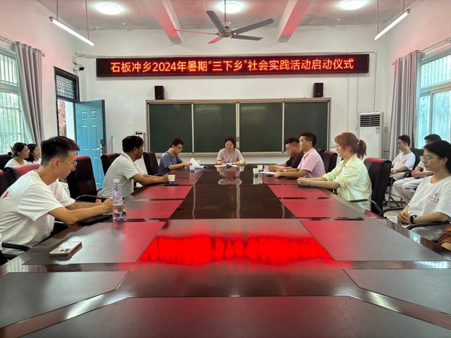 歷經(jīng)兩個小時的車程,大家順利到達石板沖鄉(xiāng)初級中學(xué)后,在會議室召開語言文化與傳媒學(xué)院2024年暑期“三下鄉(xiāng)”社會實踐活動啟動儀式。儀式上,石板沖鄉(xiāng)副鄉(xiāng)長蘇越越與中小學(xué)校領(lǐng)導(dǎo)對語言文化與傳媒學(xué)院暑期三下鄉(xiāng)團隊的到來表示熱烈歡迎,緊接著向在場參會人員介紹了當(dāng)?shù)氐奶厣皡^(qū)和獨特風(fēng)光,推薦大家可以前去采風(fēng),著重強調(diào)了對本次實踐活動的工作安排,提供優(yōu)質(zhì)文化供給,將“三下鄉(xiāng)”“鄉(xiāng)村振興”等工作有機結(jié)合,使“三下鄉(xiāng)”活動融入全面推進鄉(xiāng)村振興和農(nóng)業(yè)農(nóng)村現(xiàn)代化的偉大征程中,為加快建設(shè)現(xiàn)代化“富強美好”作出新的更大貢獻。