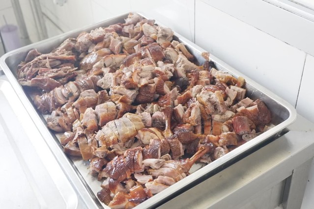當后勤組正在廚房忙碌時,合肥大學、包河區團委一行領導,冒著酷暑專程來到六安市石板沖鄉初級中學,為合肥大學語言文化與傳媒學院暑期三下鄉實踐團隊送來了一份特別的禮物——六只剛出爐的烤鴨。7月4日中午11:30,后勤組的成員們已在蒸騰的煙火氣里備好了豐盛的午餐:番茄炒蛋金黃赤紅,土豆燉牛肉熱氣騰騰,炒包菜清脆油亮,烤鴨皮脆肉香,爽口涼菜清新解膩,再輔以一碗溫潤鮮香的紫菜蛋湯。隊員們排隊打飯,濃郁的飯香瞬間撫平了奔波的疲憊,菜色的精心變化與誘人色澤讓連續奮戰多日的伙伴們眼中一亮,疲憊的神情被驚喜和滿足取代。后勤組成員們一邊忙碌地分發餐食,一邊默默觀察著隊員們的反應和就餐情況。菜單的變化并非偶然,它譜寫的不僅是美味,更是藏于柴米油鹽間的無聲關切與支持。