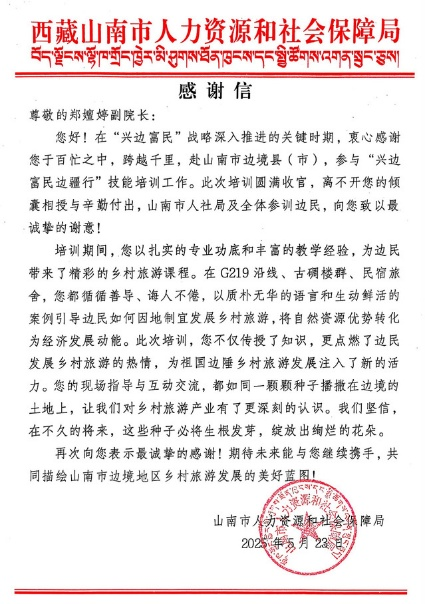 鄭嬗婷副院長作為安徽省人社廳組織的文旅專家,跨越千里,遠赴西藏,參加了歷時七天的“興邊富民邊疆行”活動,克服高原反應深入鄉鎮一線,通過現場指導、專業授課等方式為邊民傳授鄉村旅游經營管理知識,獲山南市人社局致信感謝。黨員教師張業臣、王汝幸帶領支部教師和學生赴銅陵市義安區開展調研,承擔該區旅游資源普查、“十五五”文化和旅游發展規劃編制服務項目;并在義安區文化旅游局開展培訓,指導當地旅游資源的開發與利用。