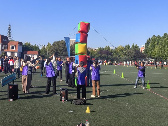 隨后,伴隨《偶像萬萬歲》的動感音樂,教職工們隊列整齊,配合默契,以穩健的步伐和靈動的動作,充分展現了教師們課堂之外的別樣風采與昂揚向上的團隊風貌。賽事環節中,文化與旅游學院教職工團結協作、表現出色?!盎鹁娼恿θΑ敝嘘爢T們默契配合、穩健傳遞;“方塊疊疊樂”考驗耐心與細心,大家沉著冷靜、精準操控;“接力拼圖”環節分工明確、反應迅速;壓軸項目“歡樂毛毛蟲”中,參賽教師步伐統一、口號響亮,將現場氣氛推向高潮。