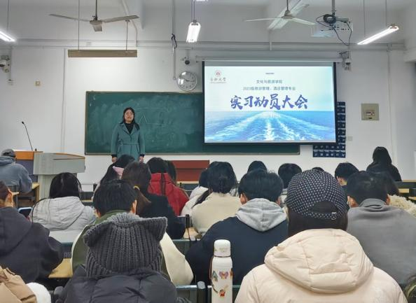11月21日,文化與旅游學院于一區博學樓A座103教室舉行2023級旅游管理、酒店管理專業實習動員大會,學院黨委副書記張愛萍、會展系主任高飛、姜陽、高騰老師及全體2023級旅游管理、酒店管理專業學生參加。