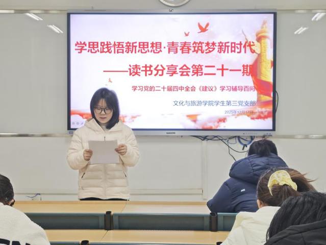 為深入學(xué)習(xí)貫徹黨的二十屆四中全會(huì)精神,推動(dòng)科技創(chuàng)新理念與文旅專(zhuān)業(yè)實(shí)踐深度融合,12月17日,文化與旅游學(xué)院學(xué)生第三黨支部成功舉辦第二十一期專(zhuān)題讀書(shū)分享會(huì)。會(huì)上,三位入黨積極分子結(jié)合專(zhuān)業(yè)所學(xué)與實(shí)踐經(jīng)歷分享心得體會(huì),展現(xiàn)了科技創(chuàng)新理論與文旅實(shí)踐的緊密聯(lián)系。