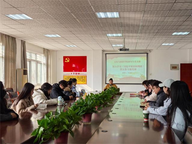 12月3日上午,合肥大學文化與旅游學院院長查金萍為研究生黨支部講授黨課,主題為“深入學習《習近平談治國理政》第五卷,勇擔新時代文旅使命”,探討如何將治國理政思想轉化為推動文旅高質量發展的實際行動。黨課由研究生黨支部書記許婧主持,全體黨員參與學習。
