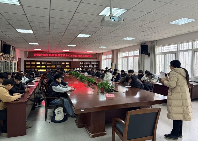為深入貫徹落實國家征兵工作政策,進一步激發學院學子投身國防、報效祖國的熱情,幫助同學們全面了解最新征兵信息,2025年12月24日,文化與旅游學院在學院會議室舉辦征兵工作動員宣講會。本次宣講會特別邀請到合肥大學征兵辦公室鄭國平老師擔任主講嘉賓,學院就業聯絡員陳偉老師及2022級、2023級學生代表參加了此次活動。