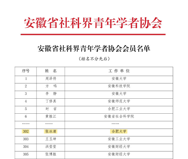 近日,安徽省社科界青年學(xué)者協(xié)會會員名單公布,合肥大學(xué)文化與旅游學(xué)院新聞與數(shù)字傳媒系副教授張冰清博士入選協(xié)會會員。