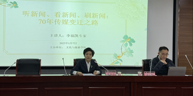 2026年1月7日上午,合肥日報傳媒集團(合肥日報社)編委、視覺中心主任李福凱應邀在合肥大學一期學術報告廳舉行一場名為《聽新聞、看新聞、刷新聞:70年傳媒變遷之路》的專題講座。文化與旅游學院的部分師生參加了此次講座。