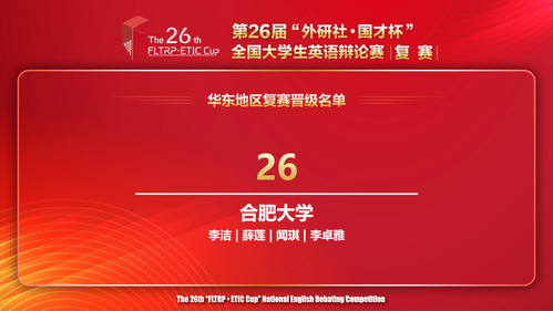 “外研社·國才杯”全國大學生英語辯論賽是2023年全國普通高校學科競賽排行榜內競賽項目,由北京外國語大學主辦,外語教學與研究出版社、北京外國語大學中國外語測評中心、北京外研在線數字科技有限公司承辦。本屆大賽于2023年11月啟動,復賽分為華北、華東、華南和華西四個賽區,采取線上比賽的形式。復賽包含五輪循環賽和總決賽。在循環賽環節,各參賽隊伍須完成5輪比賽獲得相應積分。最后,積分排名靠前的隊伍獲得全國決賽的參賽資格。