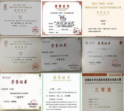 在學(xué)習(xí)與成長(zhǎng)的道路上,她們奮發(fā)進(jìn)取,累積了豐碩成果。寢室長(zhǎng)胡婷婷發(fā)揮自身特長(zhǎng),勇于嘗試,先后獲得2024“外研社·國(guó)才杯”“理解當(dāng)代中國(guó)”英語(yǔ)筆譯安徽省三等獎(jiǎng)及“互聯(lián)網(wǎng)+”大學(xué)生創(chuàng)新創(chuàng)業(yè)大賽校級(jí)銀獎(jiǎng)。吳瑞潔連續(xù)三年獲評(píng)校級(jí)“三好學(xué)生”,憑借優(yōu)異成績(jī)獲校級(jí)一、二、三等獎(jiǎng)學(xué)金,并在2024“外研社·國(guó)才杯”“理解當(dāng)代中國(guó)”全國(guó)大學(xué)生外語(yǔ)能力大賽中奪得筆譯組校級(jí)金獎(jiǎng)與省級(jí)三等獎(jiǎng),同時(shí)榮獲第二十屆校園文化藝術(shù)節(jié)一等獎(jiǎng)。王子璇被評(píng)為2024年度優(yōu)秀團(tuán)員,在全國(guó)大學(xué)生英語(yǔ)競(jìng)賽、“外研社·國(guó)才杯”“理解當(dāng)代中國(guó)”綜合能力賽項(xiàng)及大學(xué)生創(chuàng)新創(chuàng)業(yè)大賽中屢獲佳績(jī),展現(xiàn)出優(yōu)秀的外語(yǔ)水平與創(chuàng)新能力。闞心月則獲得安徽省大學(xué)生國(guó)際貿(mào)易綜合技能大賽三等獎(jiǎng)、校級(jí)二等獎(jiǎng)學(xué)金以及第九屆“互聯(lián)網(wǎng)+”大學(xué)生創(chuàng)新創(chuàng)業(yè)大賽校級(jí)銀獎(jiǎng)的好成績(jī),在平凡的日子里持續(xù)閃耀著自己的光芒。