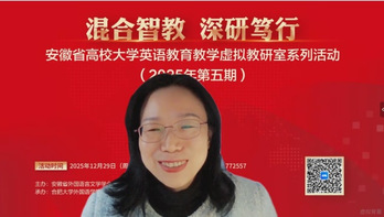 為深入推進AI智能輔助教學背景下的大學英語教學改革,探索英語教育與人才培養深度融合新路徑,由安徽省外國語言文學學會大學英語教學研究分會主辦,合肥大學外國語學院、安徽信息工程學院通識教育與外國語學院共同承辦的安徽省高校大學英語教育教學虛擬教研室系列活動(2025年第五期)于12月29日下午2點30分在線上隆重舉行。本期活動主題為“混合智教 深研篤行”,旨在通過跨校研討,共享智慧共謀發展。