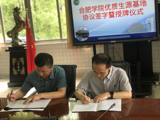 會上,雙方簽署了優質生源基地共建協議書,余勇書記授予合肥七中紫蓬分校優質生源基地牌匾。