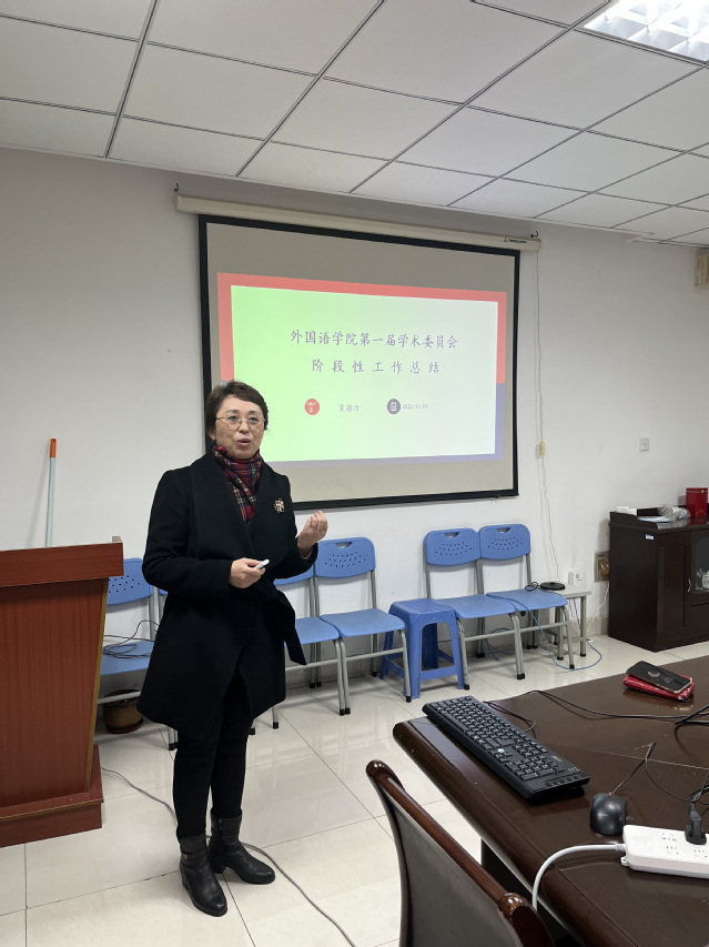 外國語學院學術委員會主任夏蓓潔教授做了外國語學院第一屆學術委員會階段性工作總結。夏教授介紹了學術委員會的人員構成、宗旨和工作流程,重點梳理總結了學術委員會的八項常規工作,在肯定學術委員會成績的同時也提出了下一步的工作方向。