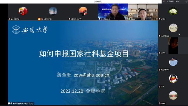 12月20日下午,安徽大學外國語學院院長、國家社科基金項目、教育部人文社科規劃基金項目、國家留學基金項目、安徽省哲學社會科學規劃項目評審專家詹全旺教授應邀通過騰訊會議,進行了“如何申報國家社科基金項目”的學術報告。此次報告由校科研處和外國語學院主辦、校科協協辦,是學校“南艷湖大講堂學術報告”系列之一。