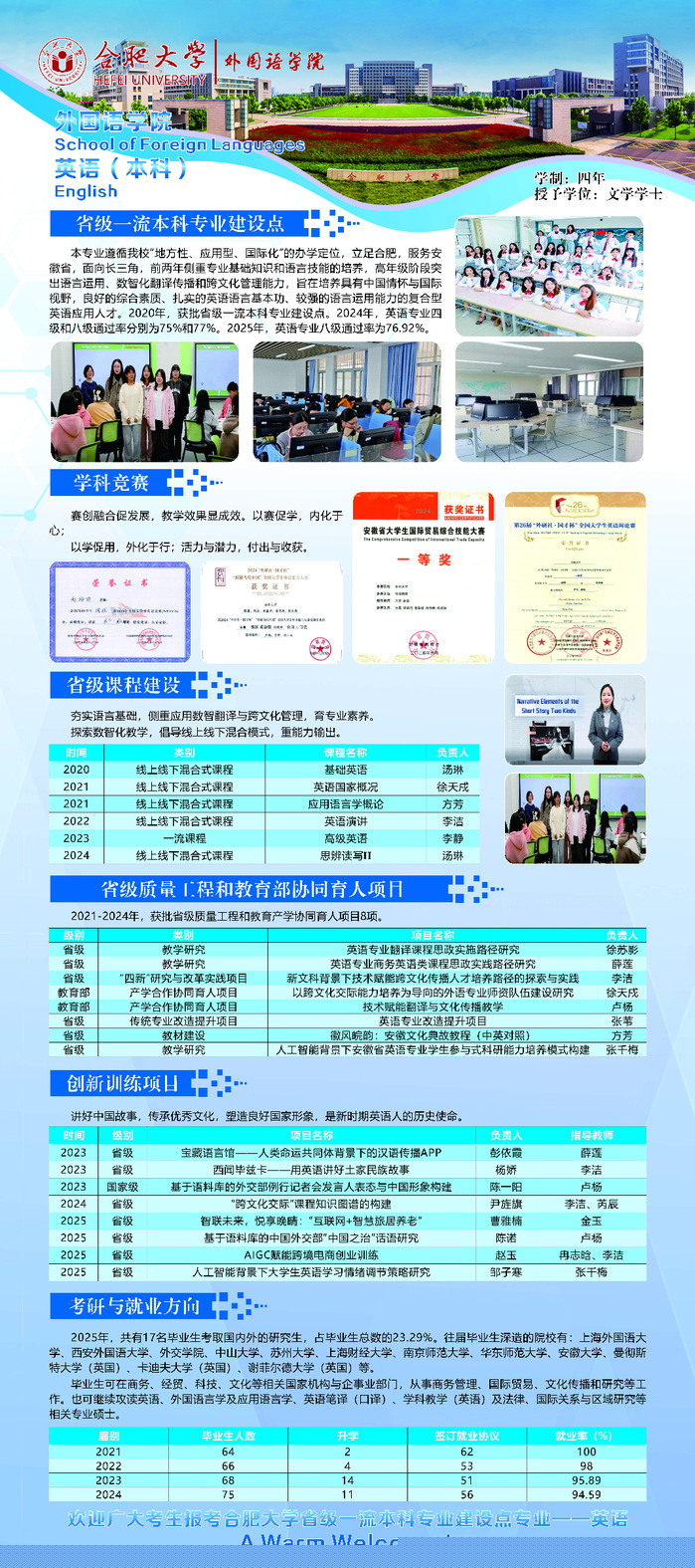 省級“一流本科專業(yè)建設(shè)點”專業(yè)。本專業(yè)打造分層次的集中實踐和課內(nèi)實踐教學(xué)體系,開拓應(yīng)用能力的課內(nèi)外輸出路徑,提升學(xué)生講好中國故事、安徽外宣話語的寫作、演講、翻譯和闡釋能力。畢業(yè)生具有較好的信息技術(shù)、思辯能力、創(chuàng)新創(chuàng)業(yè)意識,較高的應(yīng)用翻譯能力和跨文化傳播能力,具備翻譯和比較文學(xué)與跨文化學(xué)科知識與能力。