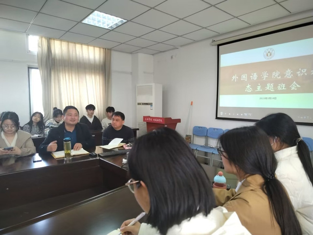 3月14日中午,外國(guó)語學(xué)院組織學(xué)生骨干召開意識(shí)形態(tài)工作專題會(huì)議,院黨委副書記吳孔寶和22個(gè)班級(jí)的66名班長(zhǎng)、團(tuán)支書、思政委員參加會(huì)議,院學(xué)工辦主任李發(fā)俊主持會(huì)議。