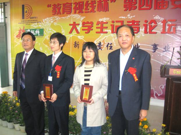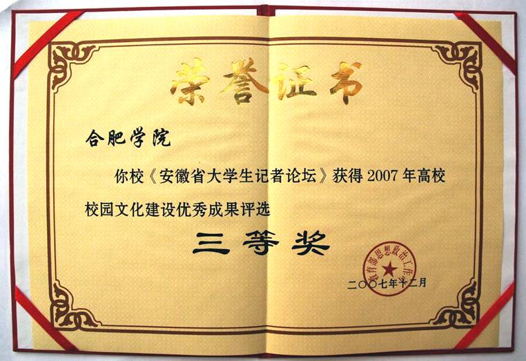 在2007年教育部思政司公布的全國高校校園文化建設優秀成果評選中,“安徽省大學生記者論壇”獲得三等獎,充分展示了我省大學生的社會主人翁精神、自主創造性和思想層次性。