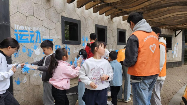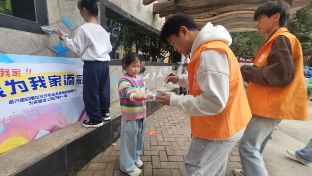 座談會后,設計學院學生黨員志愿者迅速行動,以“社區生活場景”“童趣元素”為主題,在背景墻展開繪畫創作。同時,志愿者們主動邀請社區內小朋友參與進來,手把手指導孩子們勾勒線條、填充色彩。原本單調的灰色墻面,逐漸呈現出鄰里互助、孩童嬉戲的生動畫面;孩子們在創作中笑聲不斷,不僅體驗了繪畫樂趣,更增強了對社區的歸屬感。此次實踐既讓學生黨員將專業技能轉化為服務民生的力量,也讓小區公共空間成為“看得見溫度、留得住回憶”的溫馨載體。