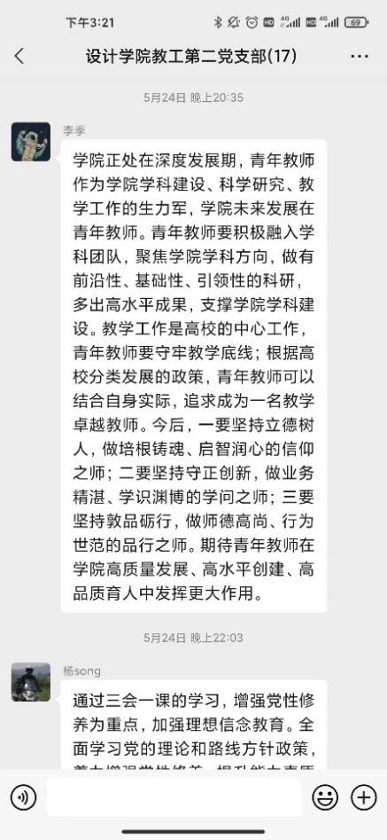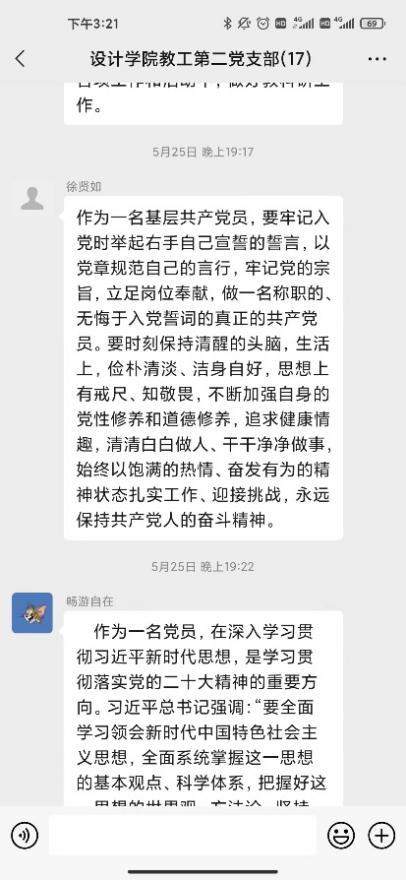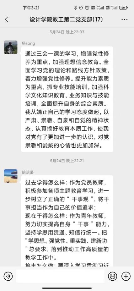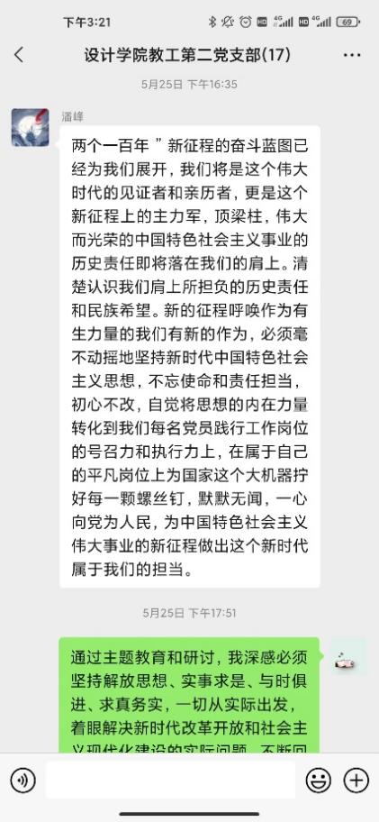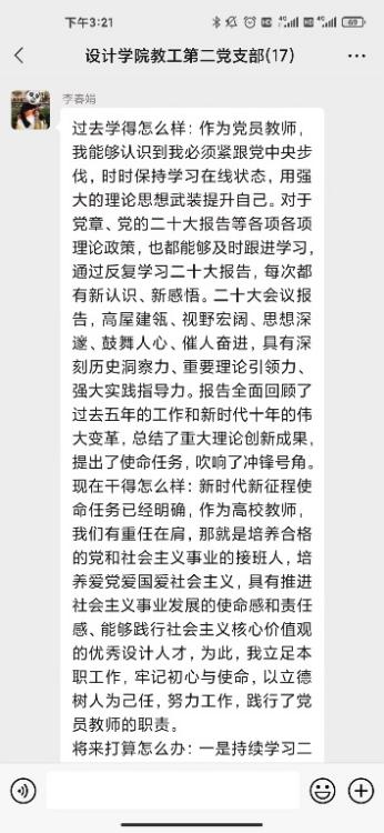 研討會第二環(huán)節(jié)支部黨員針對合實(shí)際圍繞“三問”(過去學(xué)得怎么樣、現(xiàn)在干得怎么樣、將來打算怎么辦)展開了線上交流研討。黨員教師在支部微信群積極展開研討,深入剖析過去、現(xiàn)在、未來的工作和學(xué)習(xí)。