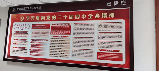 智建學院黨委同時在學院網頁設置滾動浮窗、在學院三樓宣傳欄布置《黨的二十屆四中全會公報》主要內容的展板,做好黨的二十屆四中全會精神的宣傳工作。(圖)(智能建造與交通工程學院 撰稿人:王艷麗 一審:劉艷雙 二審:高喬楠 三審:張永軍)