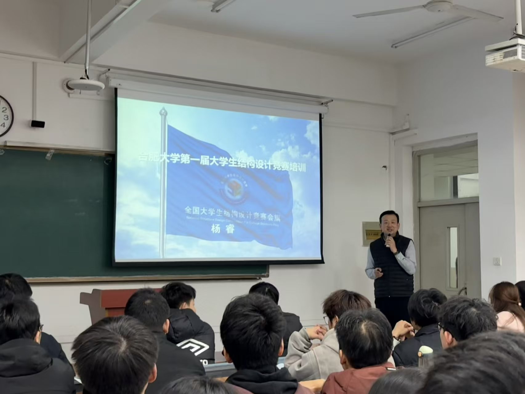 楊睿老師介紹了全國大學生結構設計競賽的基本概況和本次校級比賽的準備情況,展示了歷屆國賽賽題、獲獎作品及安徽高校參加國賽的獲獎等次,為各參賽團隊熟悉競賽規則及競賽目標奠定了基礎。
