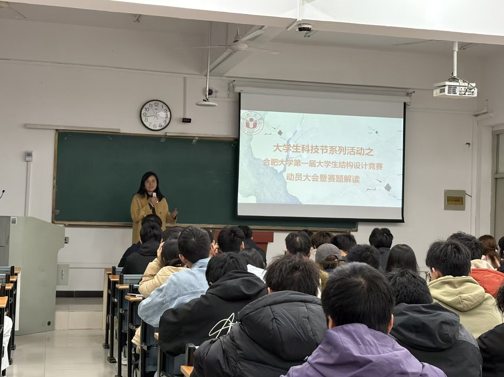 為助力參賽學子精準把握賽題核心、高效備賽,2025年12月1日晚,合肥大學第十七屆科技節系列活動暨第一屆大學生結構設計競賽賽題說明會在37棟201順利舉行,智能建造與交通工程學院黨委副書記高喬楠、楊睿老師和潘學蓓老師受邀參加了說明會。