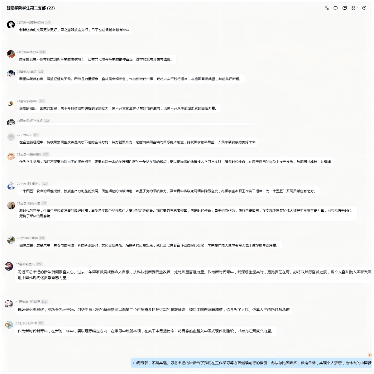 為深入學習宣傳貫徹黨的二十屆四中全會精神,學習領會習近平總書記2026年新年賀詞精神,進一步激發全體黨員的愛校情懷和奮斗熱情,智能建造與交通工程學院學生第二黨支部于2026年1月4日下午在41棟305組織開展了“學新年賀詞 聚奮進力量 譜智建新篇”主題黨日活動。支部全體黨員參加。