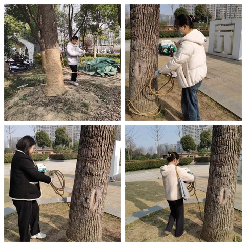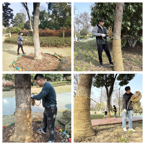活動現場,研究生志愿者戴上手套,在公園樹木養護人員的帶領下,將公園中香樟樹在冬季防寒使用的護繩一一拆解、捆綁整理,最后統一歸納回收。大家齊動手,互相配合、分工有序、有條不紊,確保每一棵樹木在氣溫回暖時得到“解衣”。