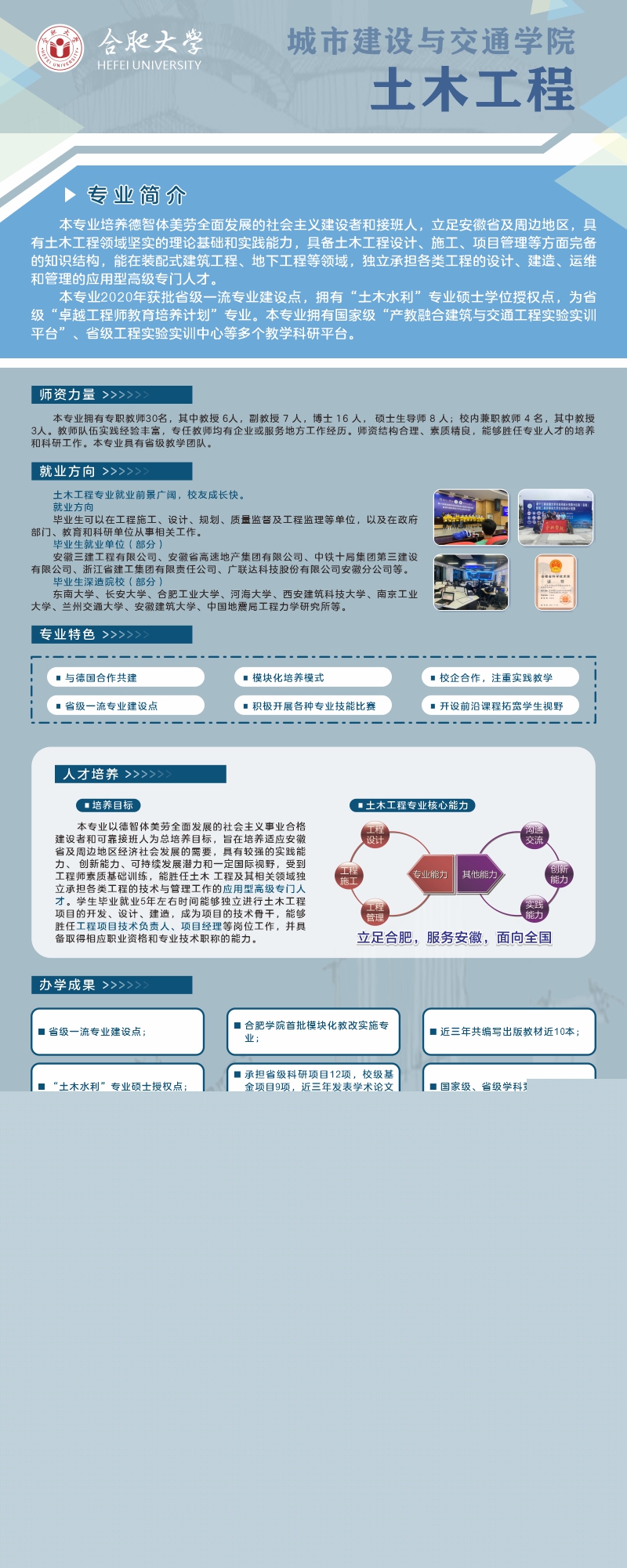培養目標及特色:本專業培養德、智、體、美、勞全面發展的社會主義事業建設者和接班人,立足安徽省及周邊地區,具有土木工程領域堅實的理論基礎和實踐能力,具備土木工程設計、施工、項目管理等方面完備的知識結構,能在裝配式建筑工程、地下空間等領域,獨立承擔各類工程的設計、建造、運維和管理的應用型高級專門人才。借鑒德國應用型人才培養模式,落實“模塊化”教育教學改革;探索“雙元制”高等教育新模式,對標行業標準,推進新工科建設;組建現代產業學院,形成產教融合協同育人模式。