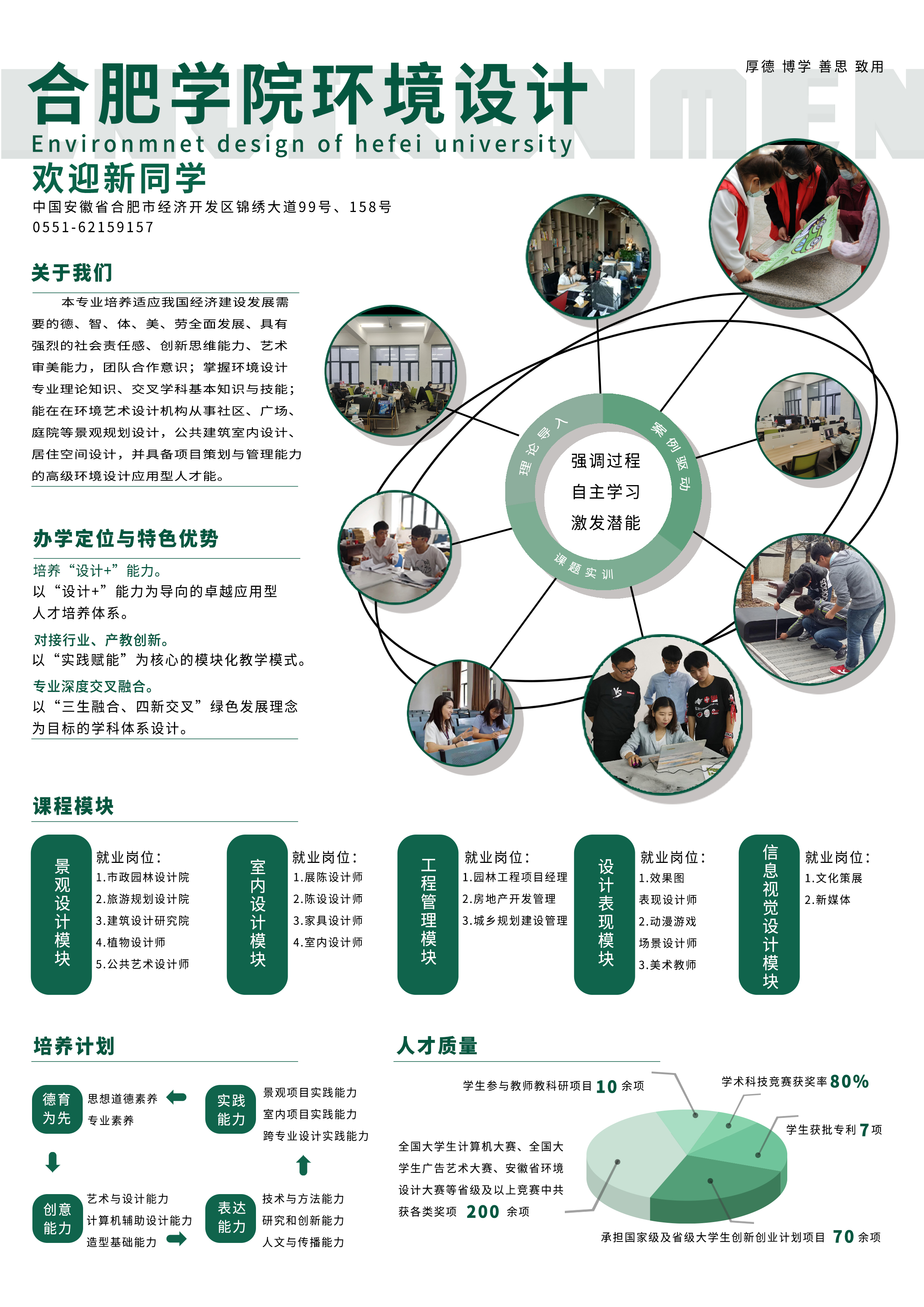 培養目標及特色:本專業培養德、智、體、美、勞全面發展、具備創新思維能力、藝術審美能力,團隊合作意識;掌握環境設計專業理論知識、交叉學科基本知識與技能的高級環境設計應用型人才。本專業注重“厚基礎、強技能”、“重實踐、強應用”的人才培養,注重產學研三方面結合和國際交流合作;另一方面重視加強與市場需求的銜接,按市場對環境設計人才的需求構建模塊化專業培養體系,以項目推動教學,將理論知識與設計實踐有機結合,強調學生發現問題、分析問題、解決問題能力的培養和創新能力的培養;組織學生參加專業設計競賽,提升設計能力。