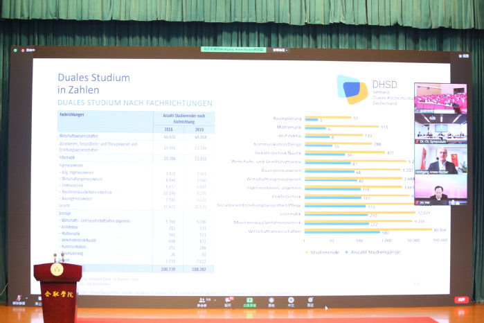 奧斯納布呂克應用科學大學雙元制教育學院院長沃爾夫岡·阿倫斯·費舍爾教授作題為《德國及奧斯納布呂克應用科學大學雙元制教育》的報告。他詳細介紹了雙元制高等教育的發展歷史和現階段的發展情況,他指出,雙元制教育的特點是具有靈活性和應用性,這種學習模式能使學生們在學習理論知識的同時收獲更多的實踐經驗。通過中德雙方十年的不懈努力,雙元制教育模式培養的學生數量不斷增多,教學學科設計更加豐富,教育體系更加完善,尤其是工程學、電子技術、計算機等領域受到企業和學生們的廣泛關注。