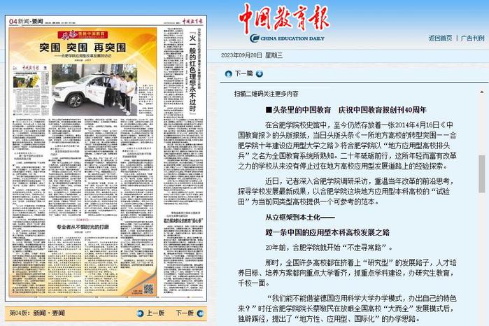 在合肥學(xué)院校史館中,至今仍然存放著一張2014年4月16日《中國(guó)教育報(bào)》的頭版報(bào)紙,當(dāng)日頭版頭條《一所地方高校的轉(zhuǎn)型突圍——合肥學(xué)院十年建設(shè)應(yīng)用型大學(xué)之路》將合肥學(xué)院以“地方應(yīng)用型高校排頭兵”之名為全國(guó)教育系統(tǒng)所熟知。二十年砥礪前行,這所年輕而富有改革之力的學(xué)校從來(lái)沒(méi)有停止過(guò)在地方高校應(yīng)用型發(fā)展道路上的經(jīng)驗(yàn)探索。