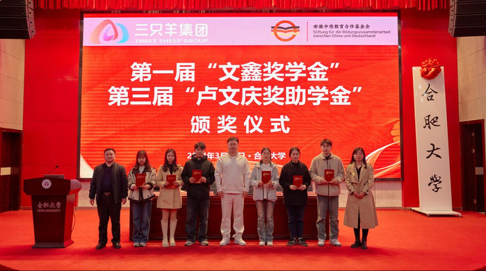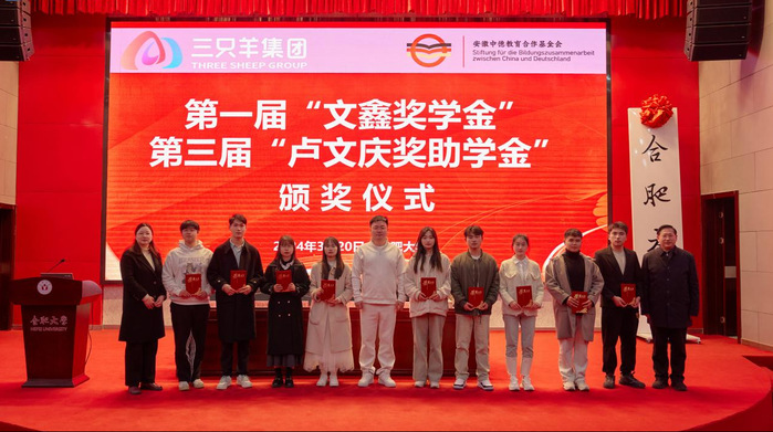3月20日下午,第一屆“文鑫獎學金”和第三屆“盧文慶獎助學金”頒獎儀式在我校圖書館報告廳A廳舉行。三只羊集團創始人兼董事盧文慶,我校副校長、安徽中德教育合作基金會理事長陳秀出席儀式,基金會辦公室主任劉金平,人工智能與大數據學院院長余海峰,人工智能與大數據學院黨委副書記、紀委書記姚蓓蓓,相關負責老師及獲獎助學生等參加儀式。儀式由基金會秘書長何世昆主持。